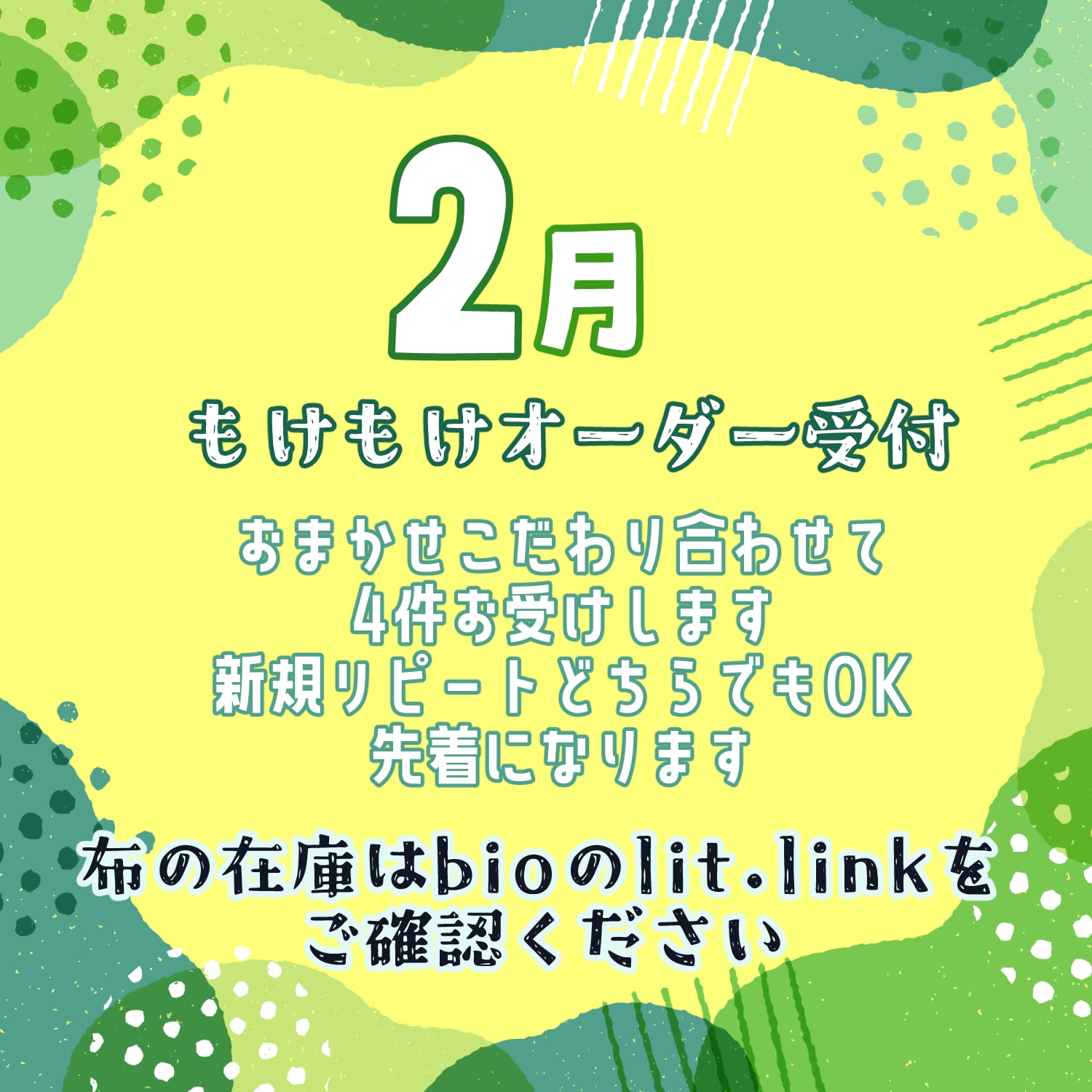 注文が完了すると制作を開始してしまいます。キャンセル不可のため完成した子が受け取り拒否や音信不通等でどうしてもお届けできない場合、1年間はいつでも送り出せるよう大事に保管させていただきますがその後はもけもけ屋でお店番になります。