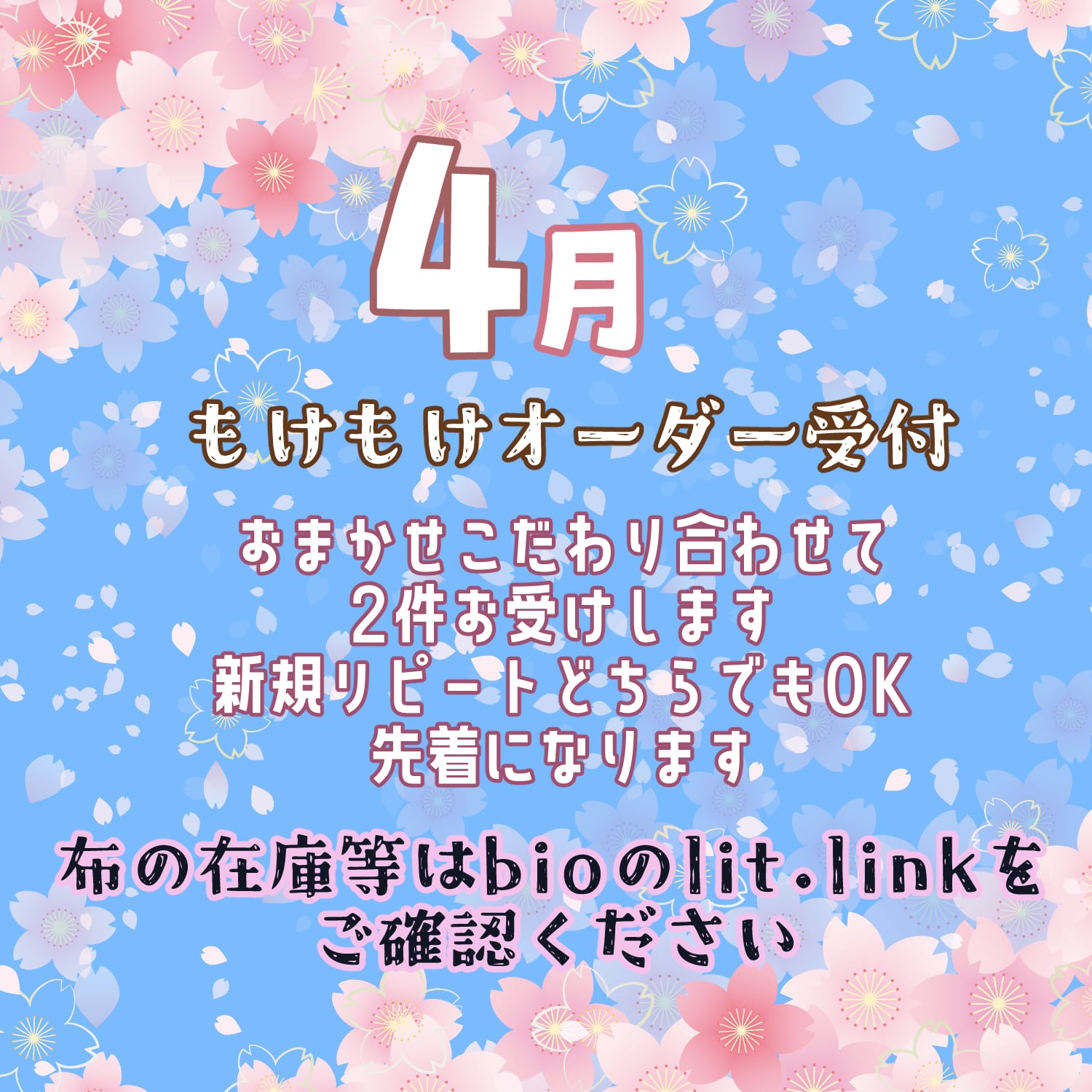 注文が完了すると制作を開始してしまいます。キャンセル不可のため完成した子が受け取り拒否や音信不通等でどうしてもお届けできない場合、1年間はいつでも送り出せるよう大事に保管させていただきますがその後はもけもけ屋でお店番になります。
